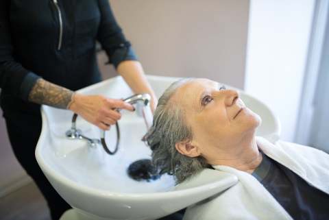 Person with grey hair having hair washed over sink by someone else