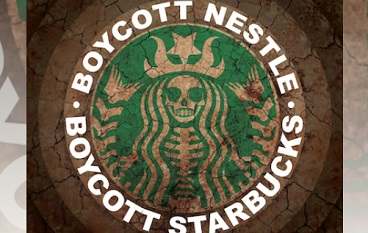 Starbucks logo with skeleton. Text saying boycott starbucks boycott nestle.