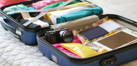 Open suitcase packed with clothes and travel things