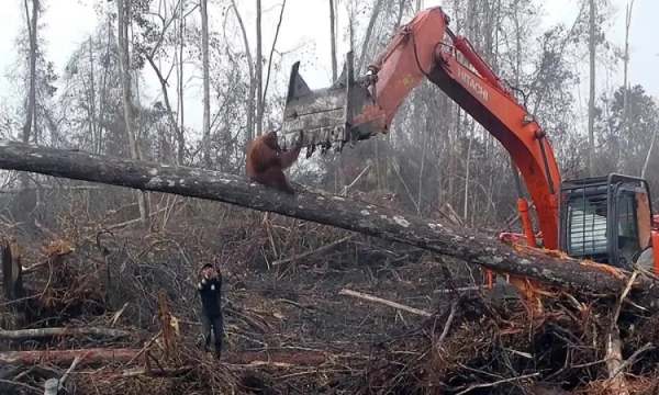 An orangutan faces up to bulldozers in West Borneo where palm oil expansion threatens the great apes' survival. Image from International Animal Rescue.