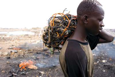 image: Ghanain man carrying electrical cables to reclaim wire